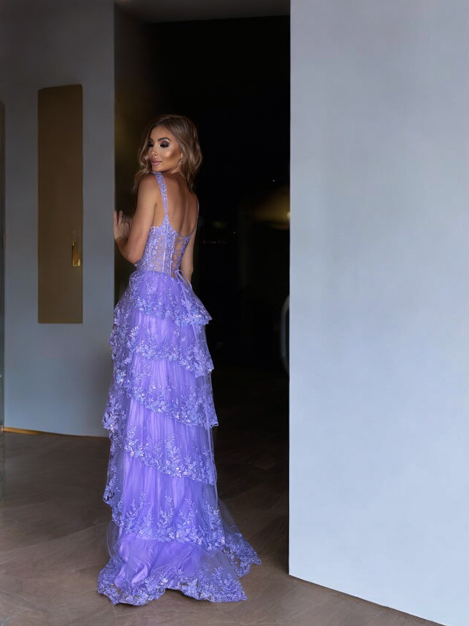 Šaty Palau – dlouhé levandulové společenské šaty s vrstvenou sukní a rozparkem – fialová