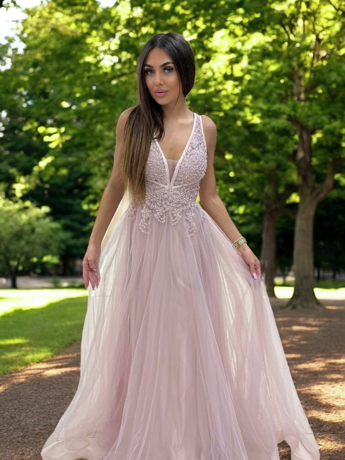 Tyto šaty si žádají doplňky, které s nimi tančí, ne soutěží. Vyber si jemné zlaté nebo šampaňské sandálky, které nechají vyniknout rozparek sukně. K tomu perlové nebo růžově zlaté šperky – drobný náhrdelník, náušnice s kapkou světla, náramek, který se pohne při každém gestu. Kabelku volte malou, ideálně metalickou nebo saténovou, aby ladila s odleskem krajky. Vlasy mohou být volně zvlněné, sepnuté jen částečně, make-up přirozený – trocha lesku na rtech a jemné světlo v očích.