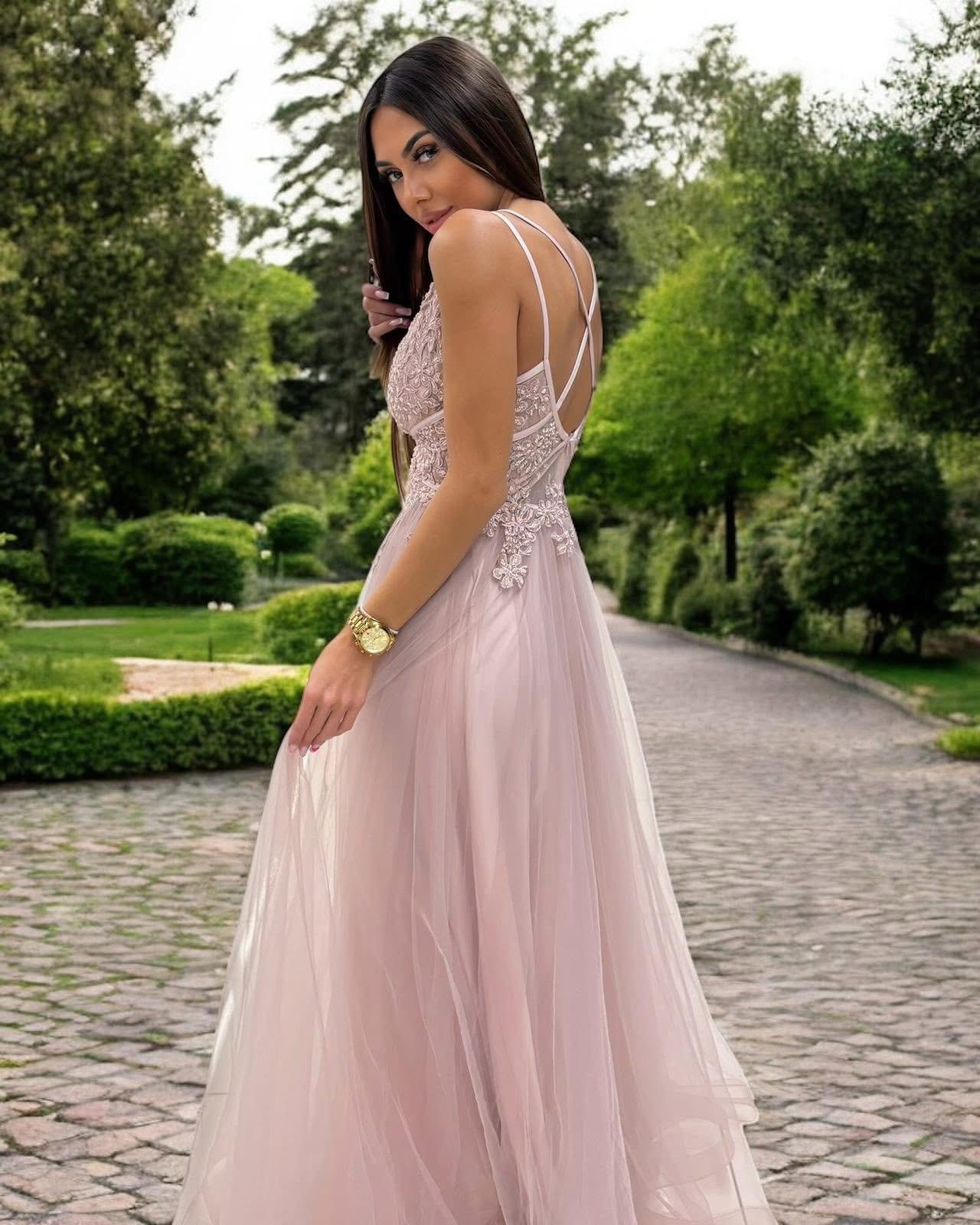 Šaty Valentina – dlouhé tylové šaty s ramínky a rozparkem a výstřihem vzadu – pudrově růžová