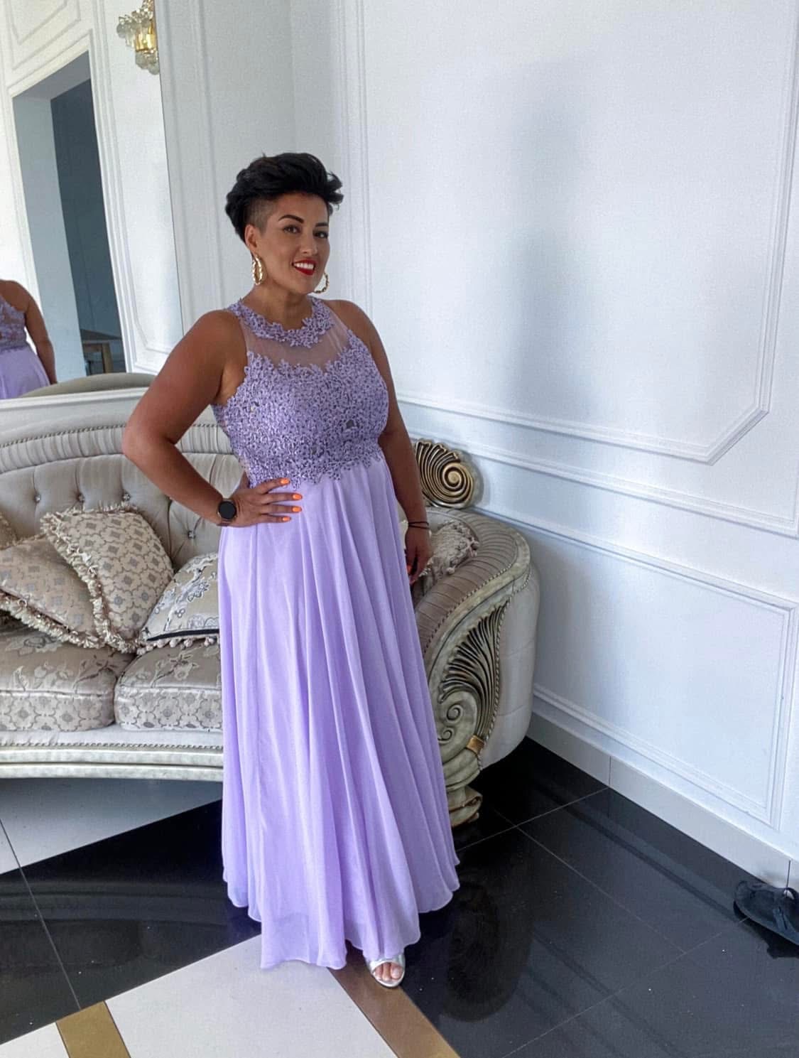 Žensky, elegantně a velmi pohodlně. Lehká šifonová sukně působí vzdušně, krajkový živůtek dodává šatům noblesu a levandulový odstín rozzáří celý vzhled.