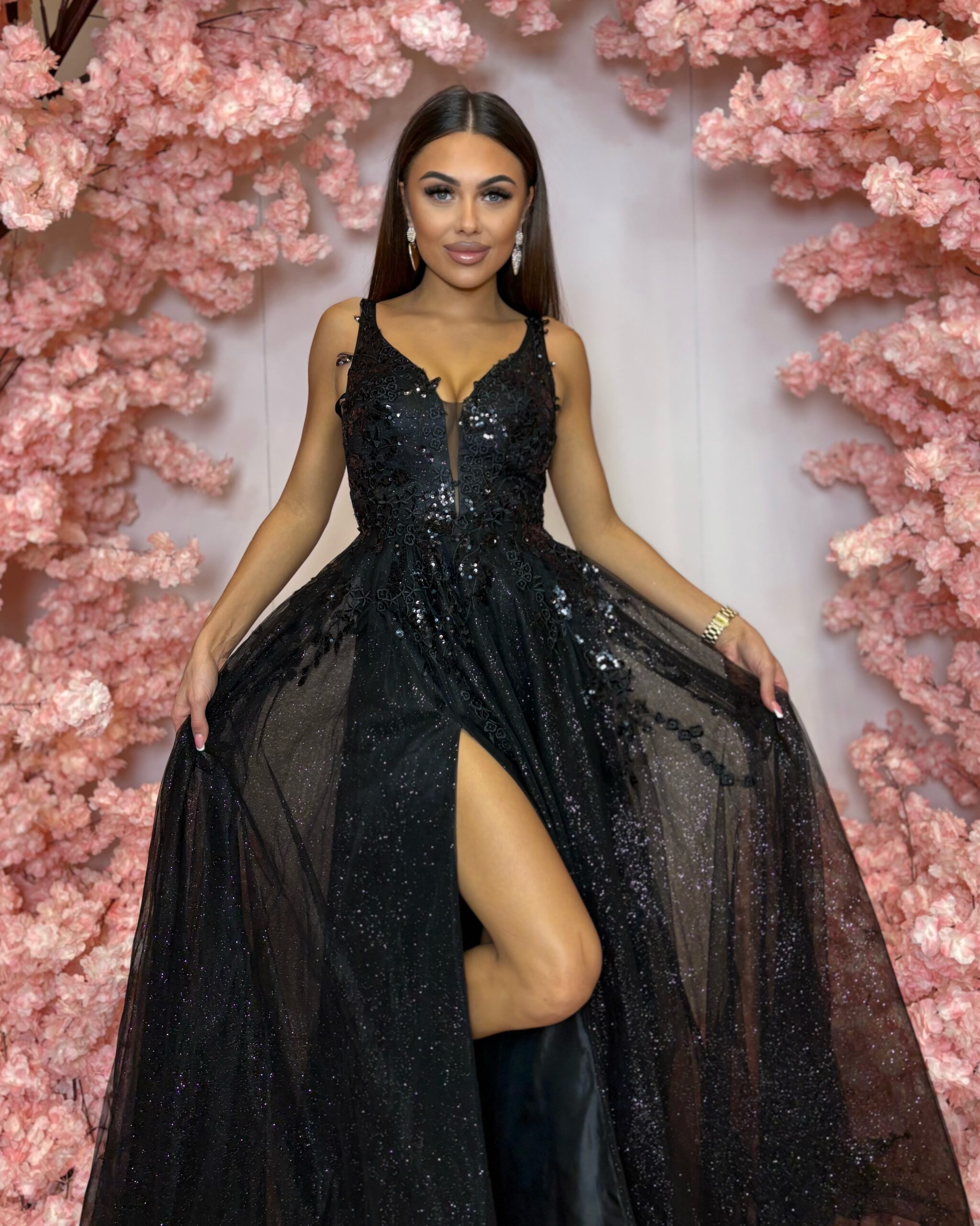 Třpytivé černé večerní šaty Rosalinder – krajkový živůtek, hluboký V-výstřih, vysoký rozparek a třpytivá tylová sukně. Elegantní dlouhé společenské šaty v A-linii, ideální na ples a slavnostní události.