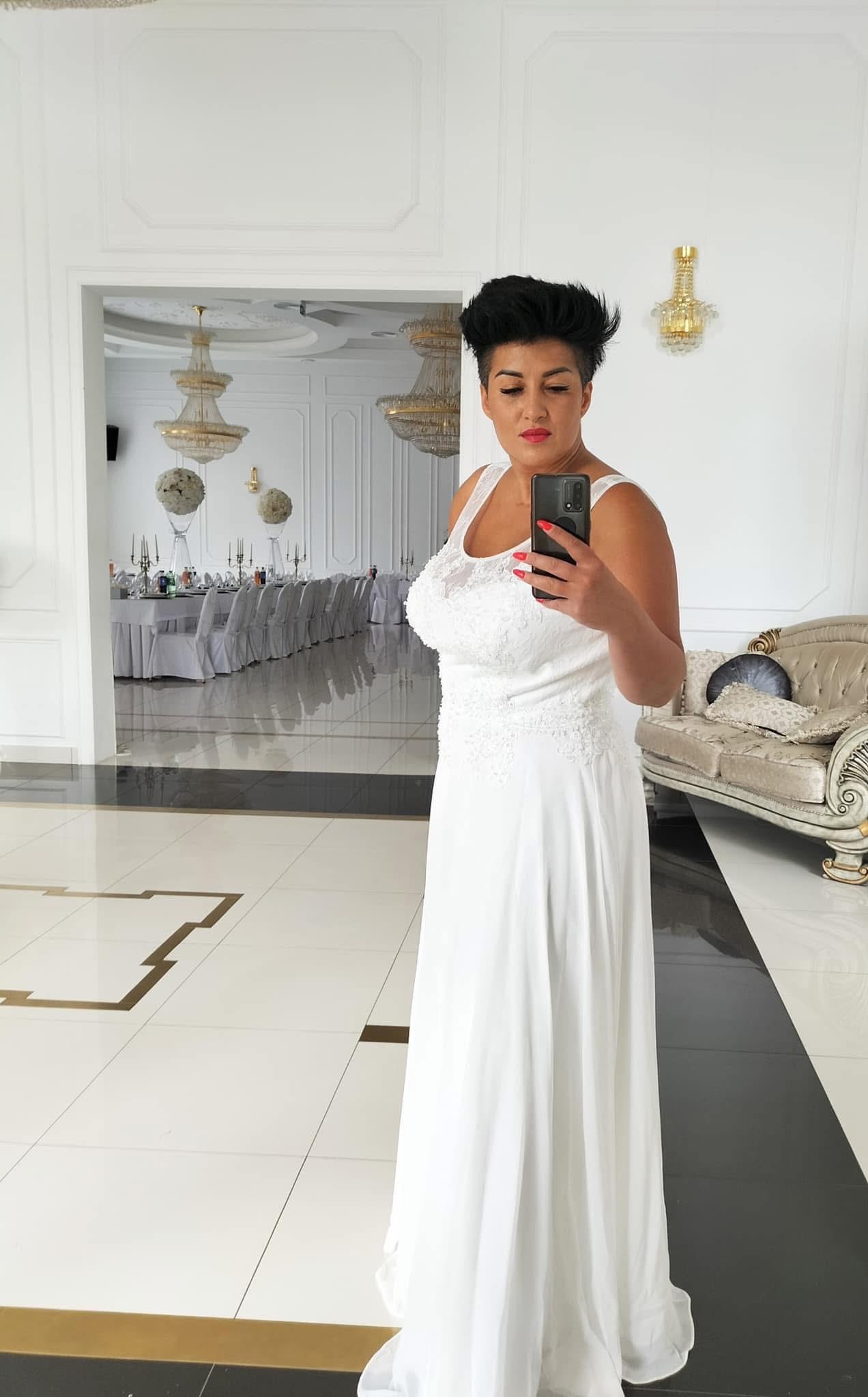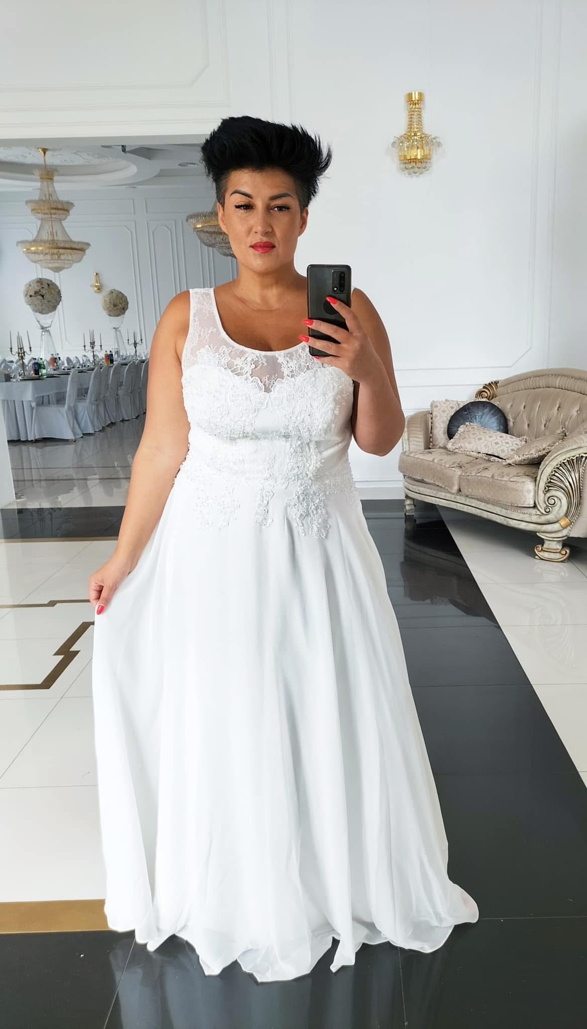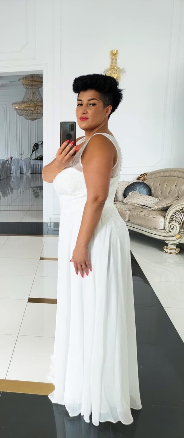 Tyto svatební šaty jsou vhodné zejména pro ženy s plnějším poprsím, které hledají stabilní horní část bez korzetu. Střih A-line se dobře přizpůsobuje různým typům postavy a zajišťuje volnost pohybu i vyvážený vzhled jak během obřadu, tak při svatební hostině.