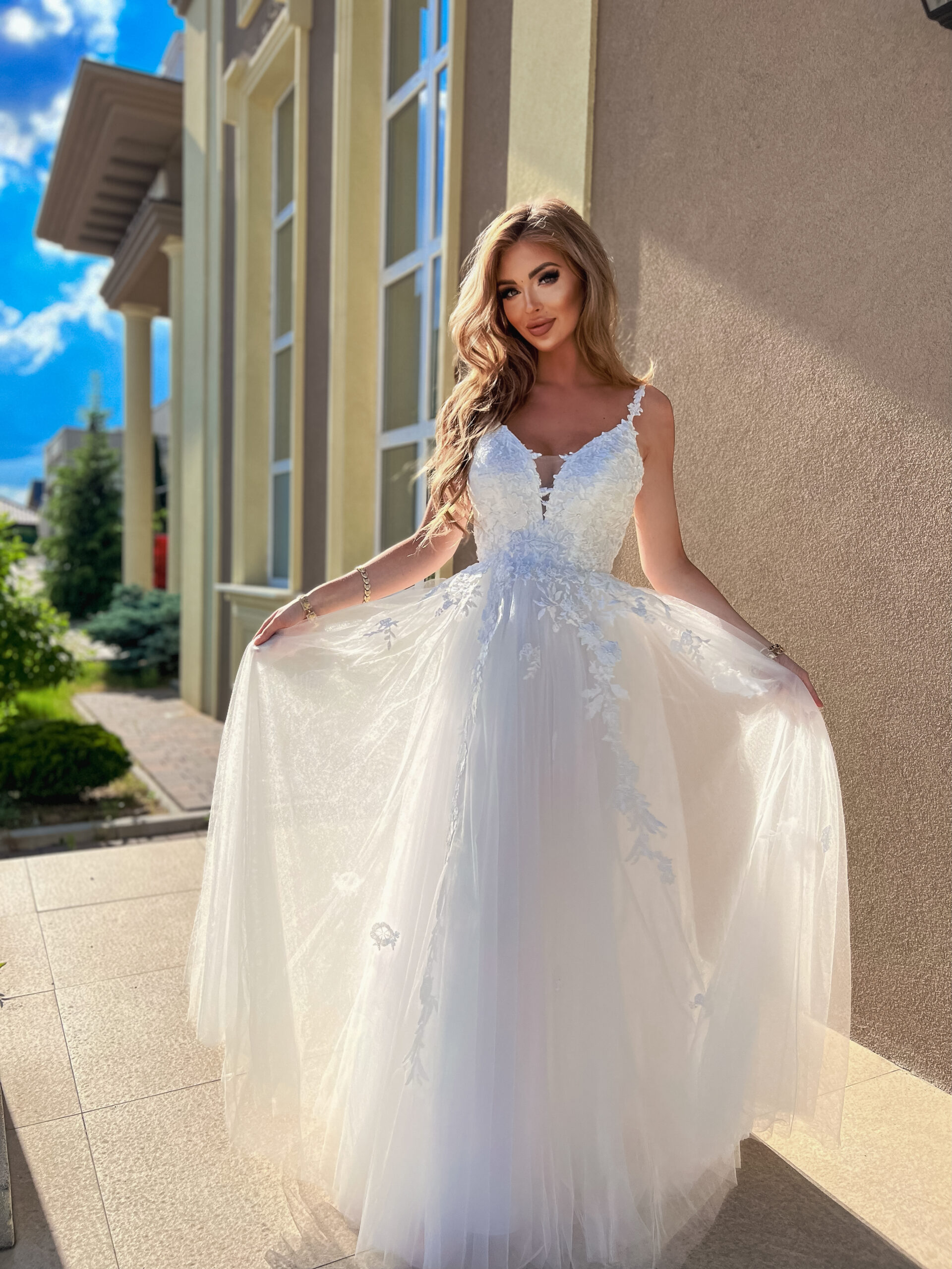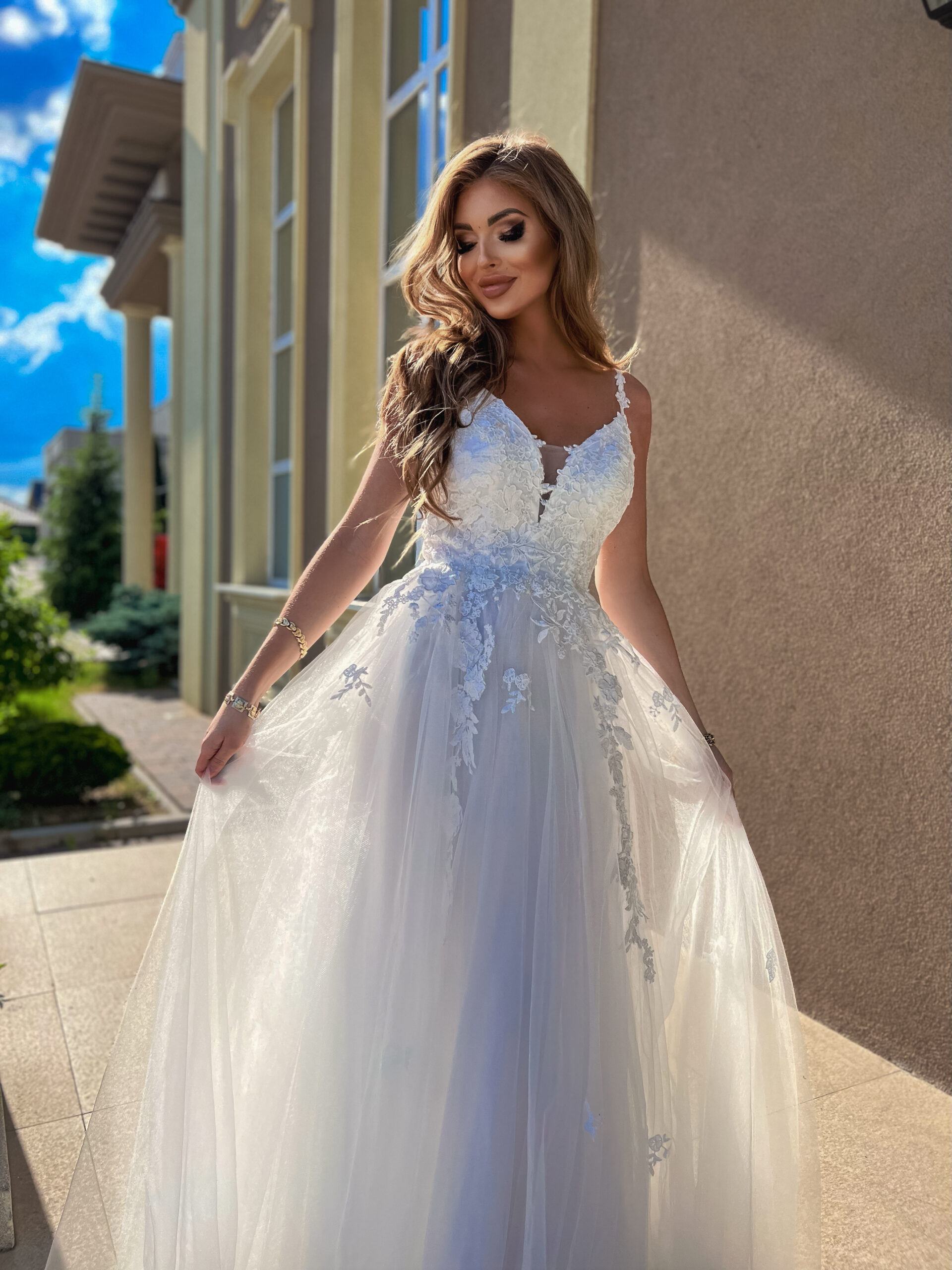 Horní část šatů je tvořena bohatě zdobenou krajkou s rostlinnými motivy. Krajka se vrství a vytváří výraznou strukturu i hloubku. Výstřih do tvaru V je jemně vyplněn transparentním tylem, který dodává celku lehkost a vizuální soudržnost. Tenká ramínka a krajkové zakončení zad podtrhují elegantní charakter modelu a přinášejí detail, který tyto šaty odlišuje od jednodušších návrhů.
