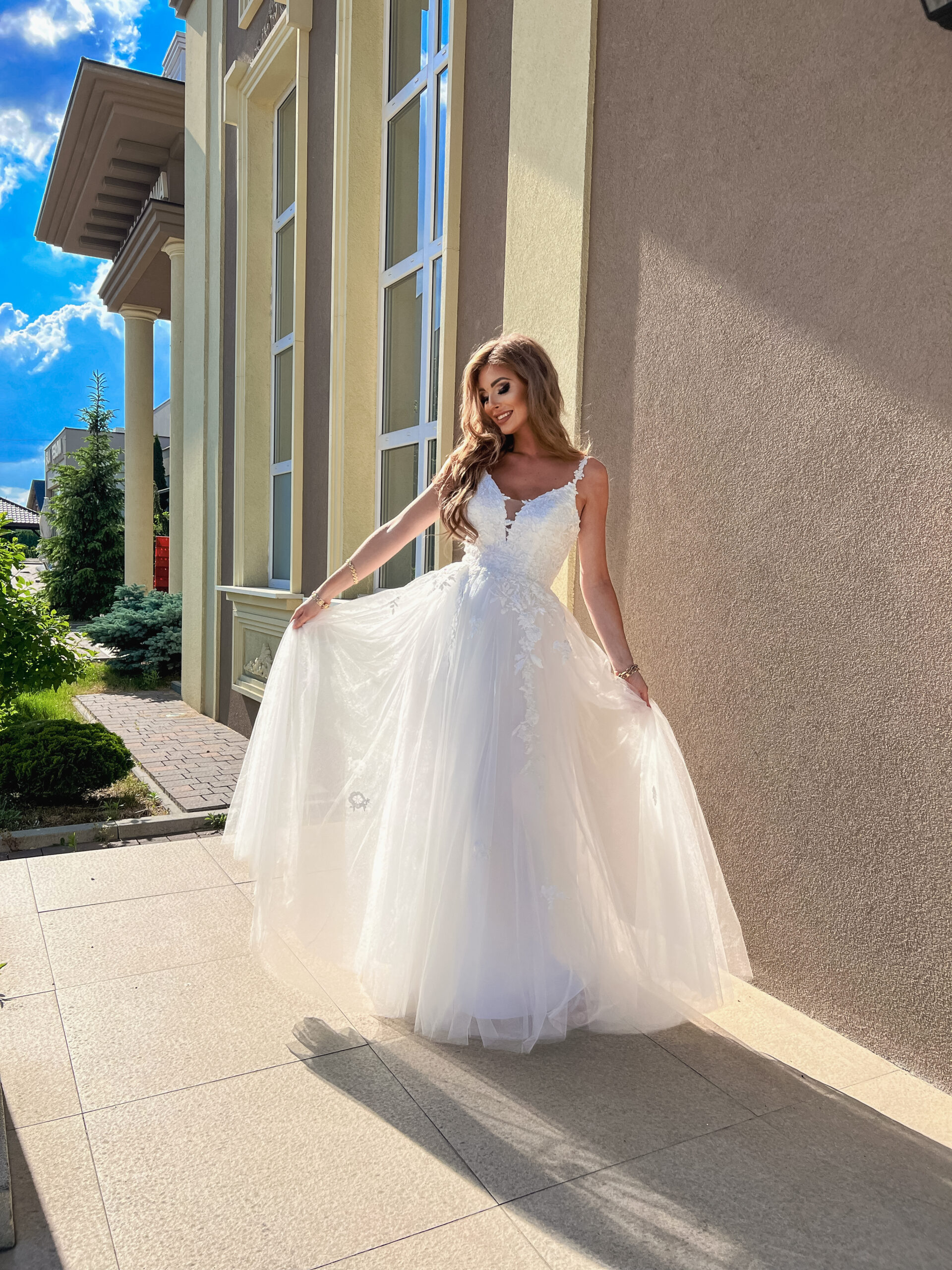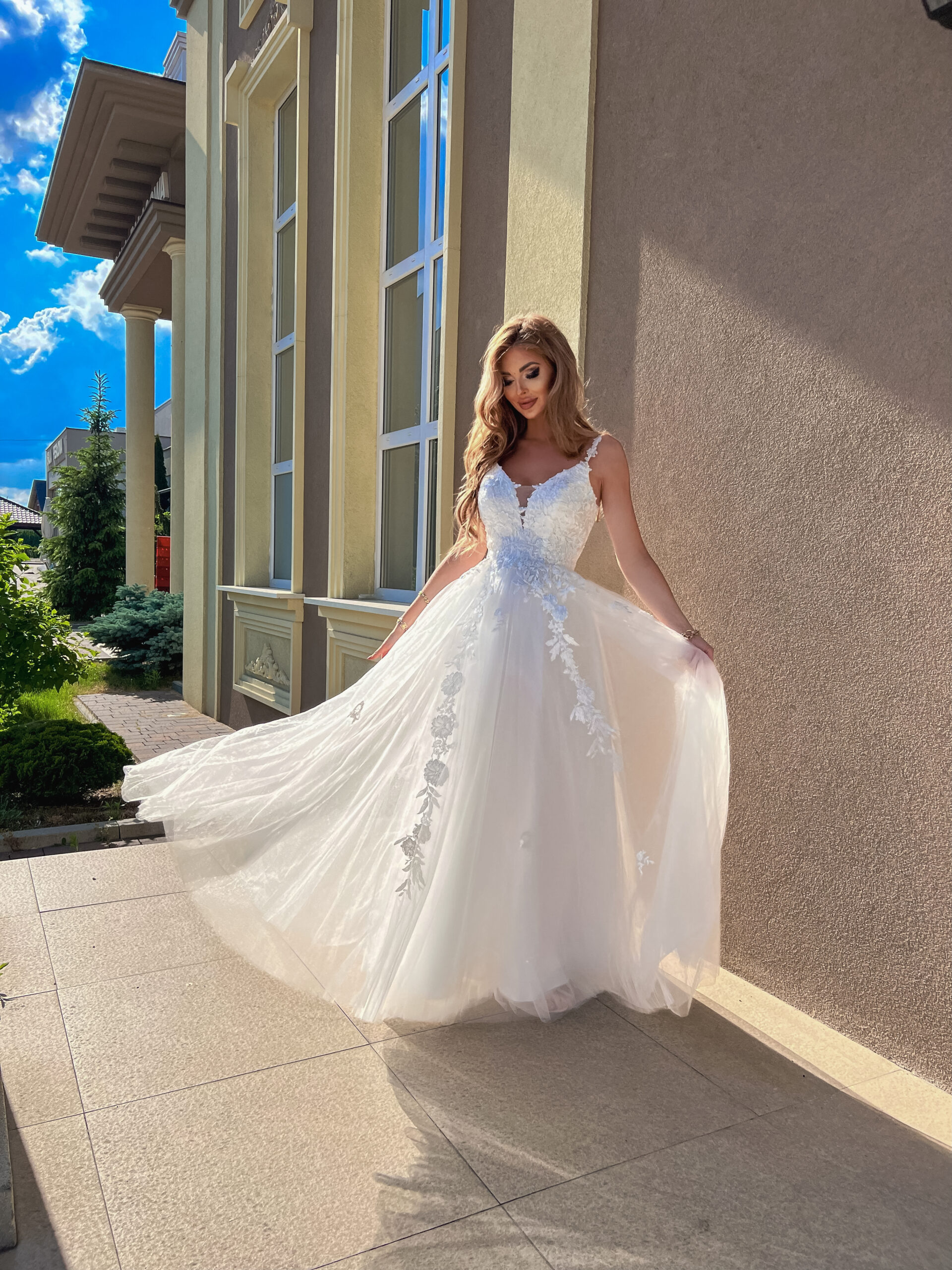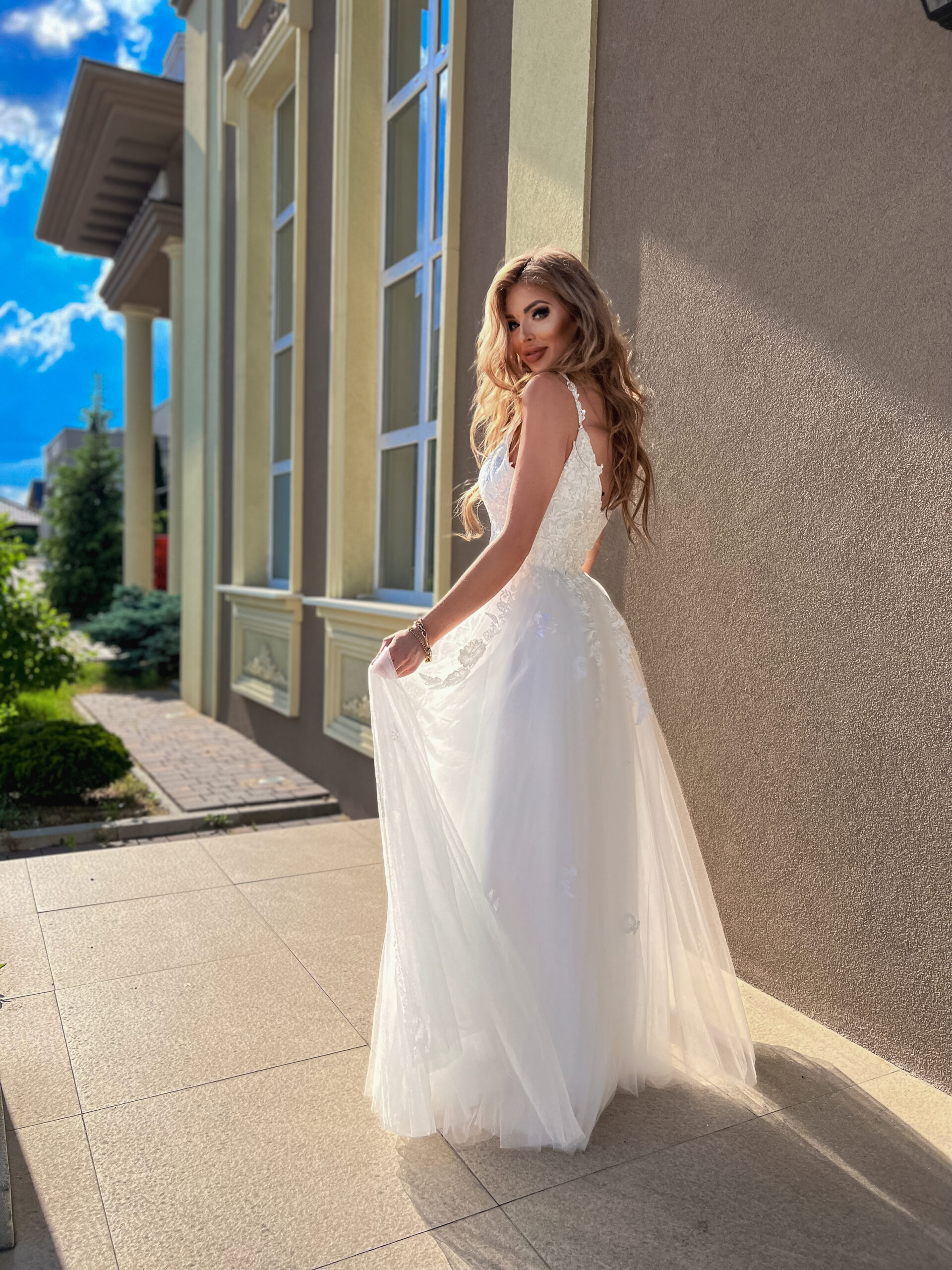Tyto svatební šaty upoutají pozornost jemnou hrou světla a poloprůhlednosti. Delikátní bílá barva v přirozeném světle působí měkce a vzdušně, zatímco splývavá sukně reaguje na každý krok a vytváří dojem lehkosti a volnosti. Celek působí romanticky, ale sebevědomě – jde o model, který stylizaci nezahlcuje, ale přirozeně ji vede.